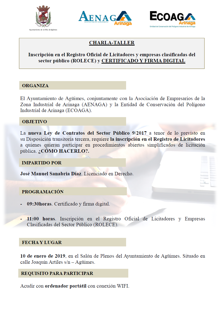 Charla-taller “Inscripción en el Registro Oficial de Licitadores y empresas clasificadas del sector público (ROLECE) y CERTIFICADO Y FIRMA DIGITAL