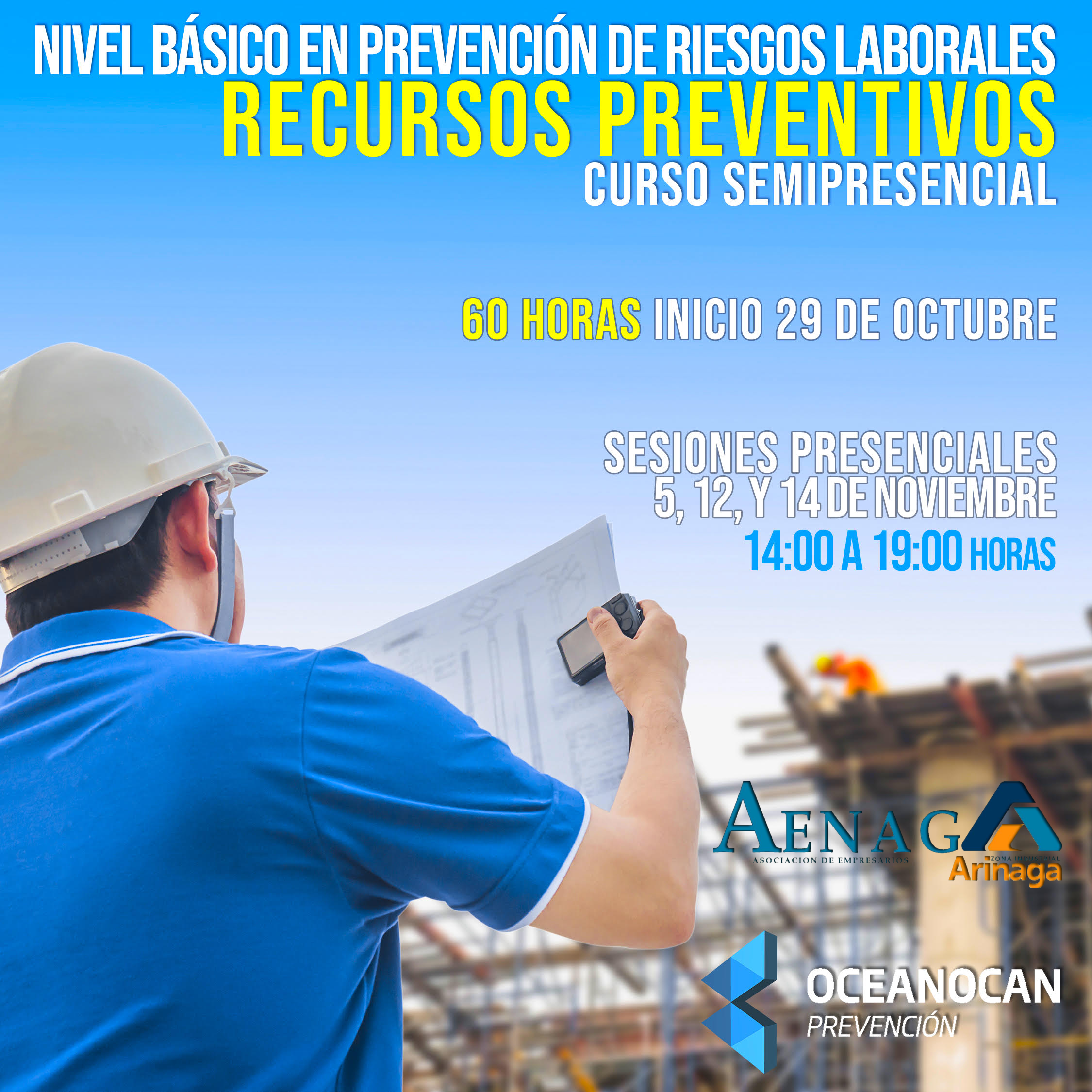 Formación. Curso Semipresencial Básico en Prevención de Riesgos Laborales. Recursos Preventivos. 60horas. 04/10/2019 Más información en el 928 149 211 o bien enviar e-mail a la dirección: info@oceanocan.com ​