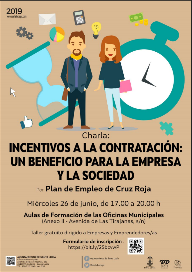 ​El proximo miércoles 26 de junio de 2019 a las 17.00 horas, tendrá lugar la Charla de Incentivos a la contratación: un beneficio para la empresa y la sociedad, impartido por Ainara Sánchez Galván​, ​en ​el​ Aula de Formación de las Oficinas Municipales del Ayuntamiento de Santa Lucía.