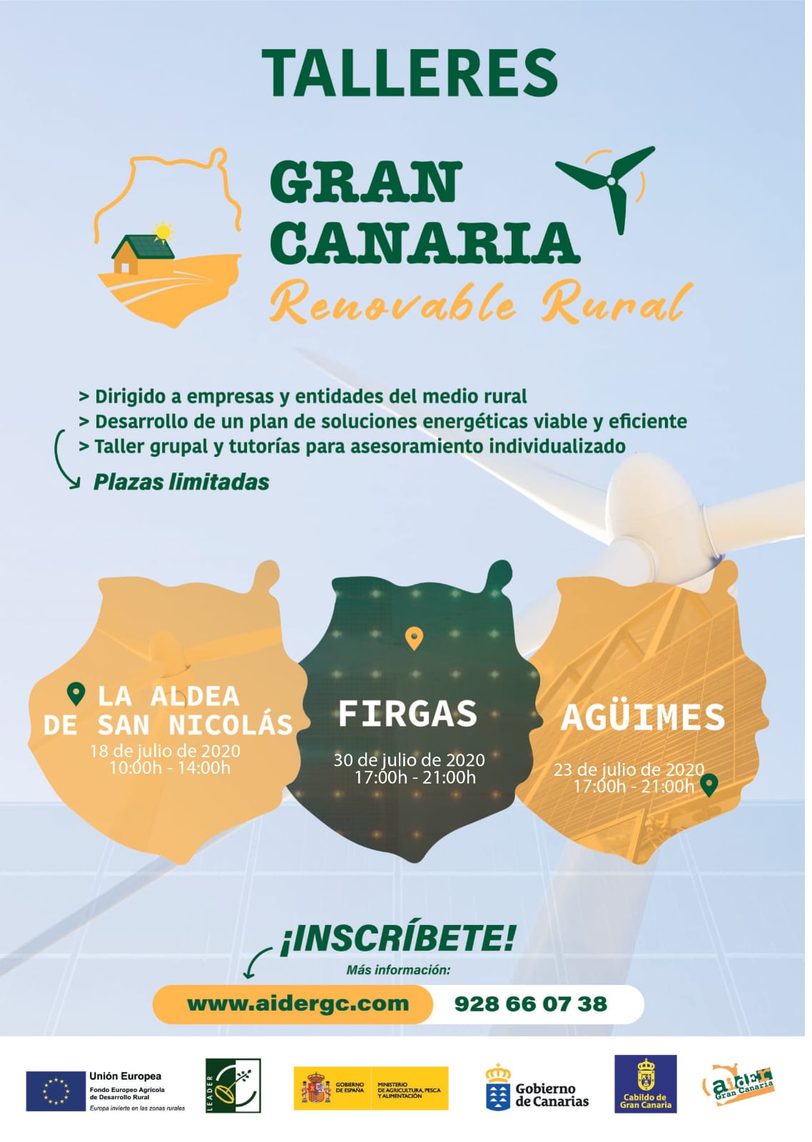 Aider GC celebrará en Agüimes este jueves, de 17.00 a 21.00 horas, uno de los tres talleres Gran Canaria Renovable Rural previstos en la isla, una acción formativa dirigida a empresas y entidades del medio rural, que cuenta con plazas limitadas, y cuya inscripción se puede formalizar en www.aidergc.com