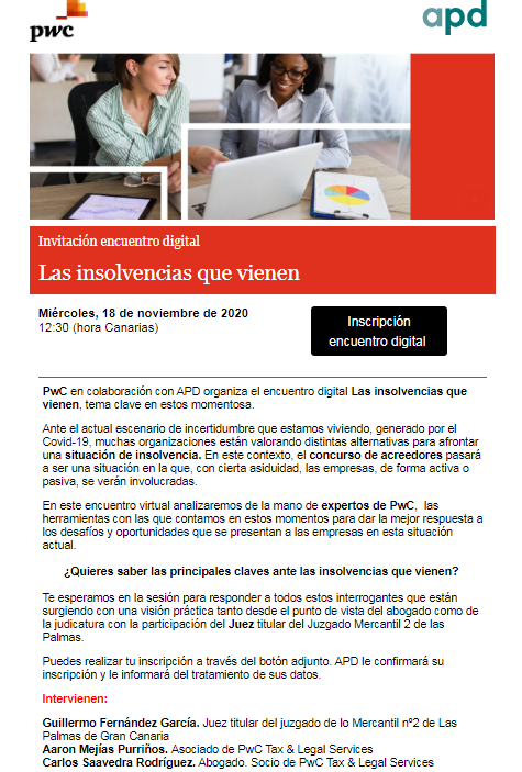 PwC - Invitación encuentro digital: "Las insolvencias que vienen". 18 de noviembre, a las 12.30 horas
