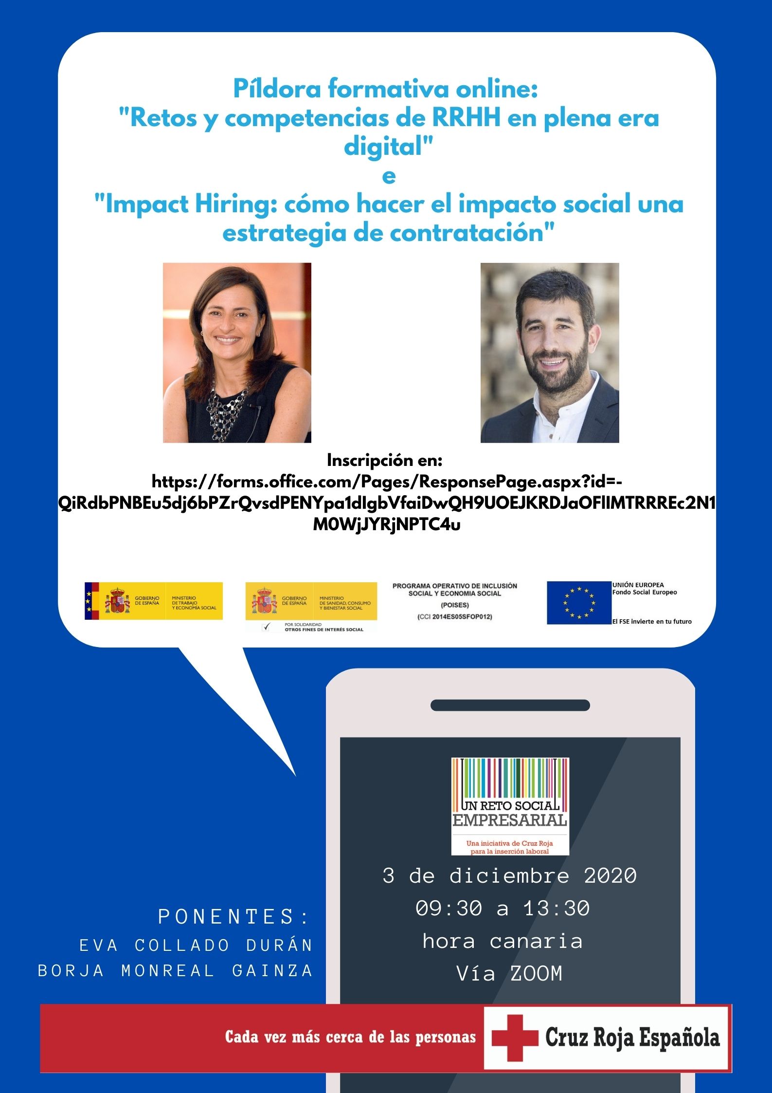 "Retos y competencias de RRHH en plena era digital"por la ponente Eva Collado Durán e "Impact Hiring: cómo hacer del impacto social una estrategia de contratación"por Borja Monreal. El próximo 03 de diciembre vía ZOOM de 09:30 a 13:30 hora canaria.