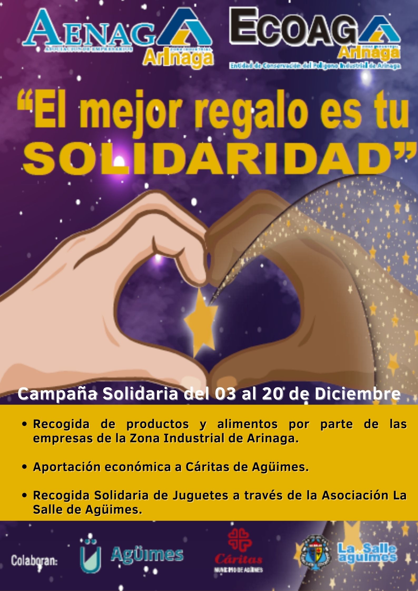 Una edición más la Asociación de Empresarios de la Zona Industrial de Arinaga (AENAGA) y la Entidad de Conservación del Polígono Industrial de Arinaga (ECOAGA), organizan la Campaña Solidaria: "El mejor regalo es tu Solidaridad", con la colaboración del Ayuntamiento de Agüimes, Cáritas del Municipio de Agüimes y Asociación la Salle de Agüimes.