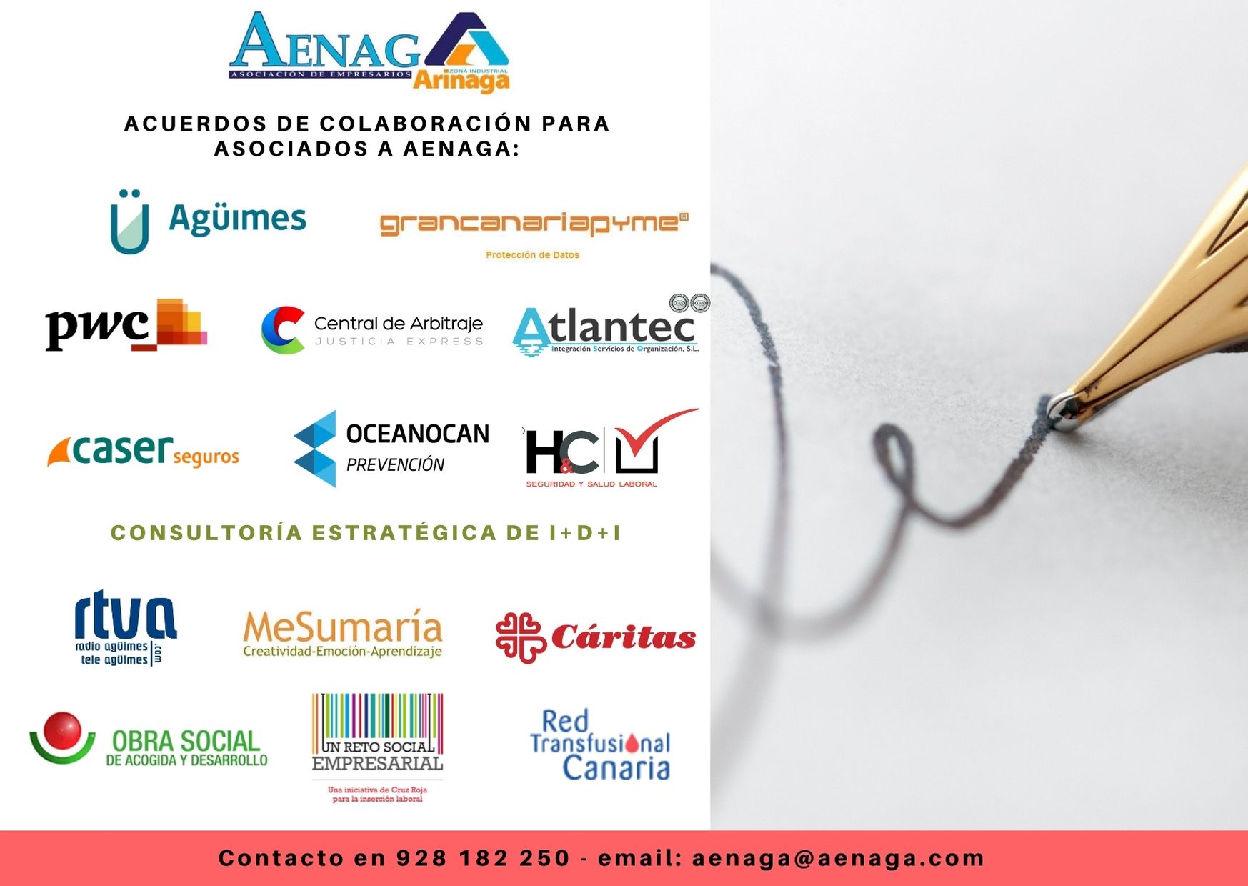 Se tratan de convenios de colaboración establecidos para beneficiar a la empresa asociada a AENAGA - Asociación de Empresarios de la zona industrial de Arinaga - AENAGA.