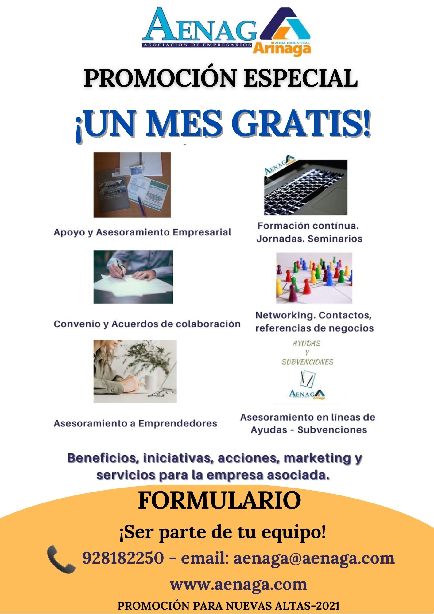 Para ello solo debes cumplimentar el formulario y disfrutar de un mes gratis. Promoción solo para nuevas altas, año 2021. Contacta con Aenaga 928 182 250 - Email: aenaga@aenaga.com