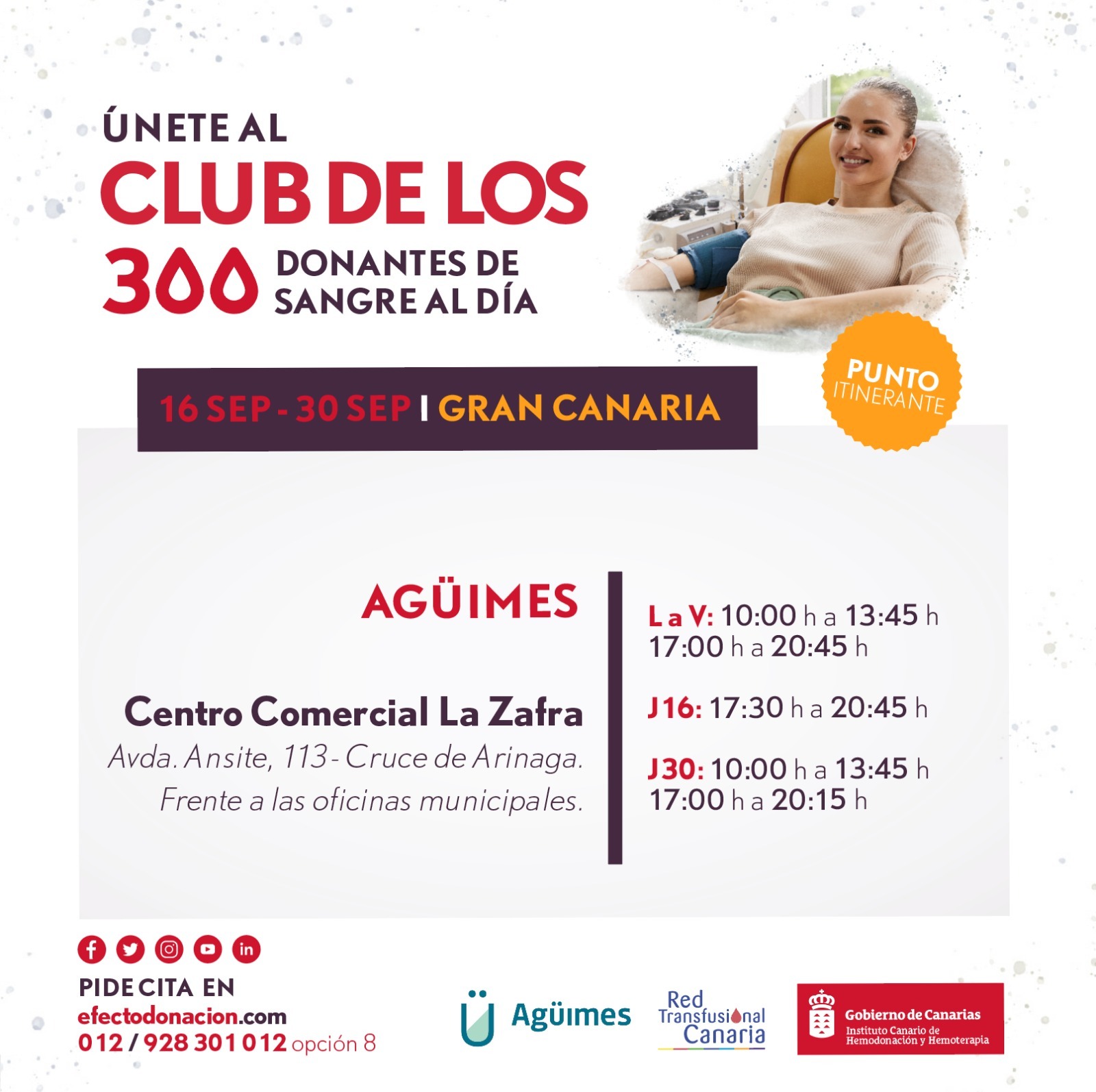 "Únete al Club de los 300 Donantes de Sangre al Día”, que tiene un punto de extracción itinerante ubicado en el Centro Comercial La Zafra, en el Cruce de Arinaga.