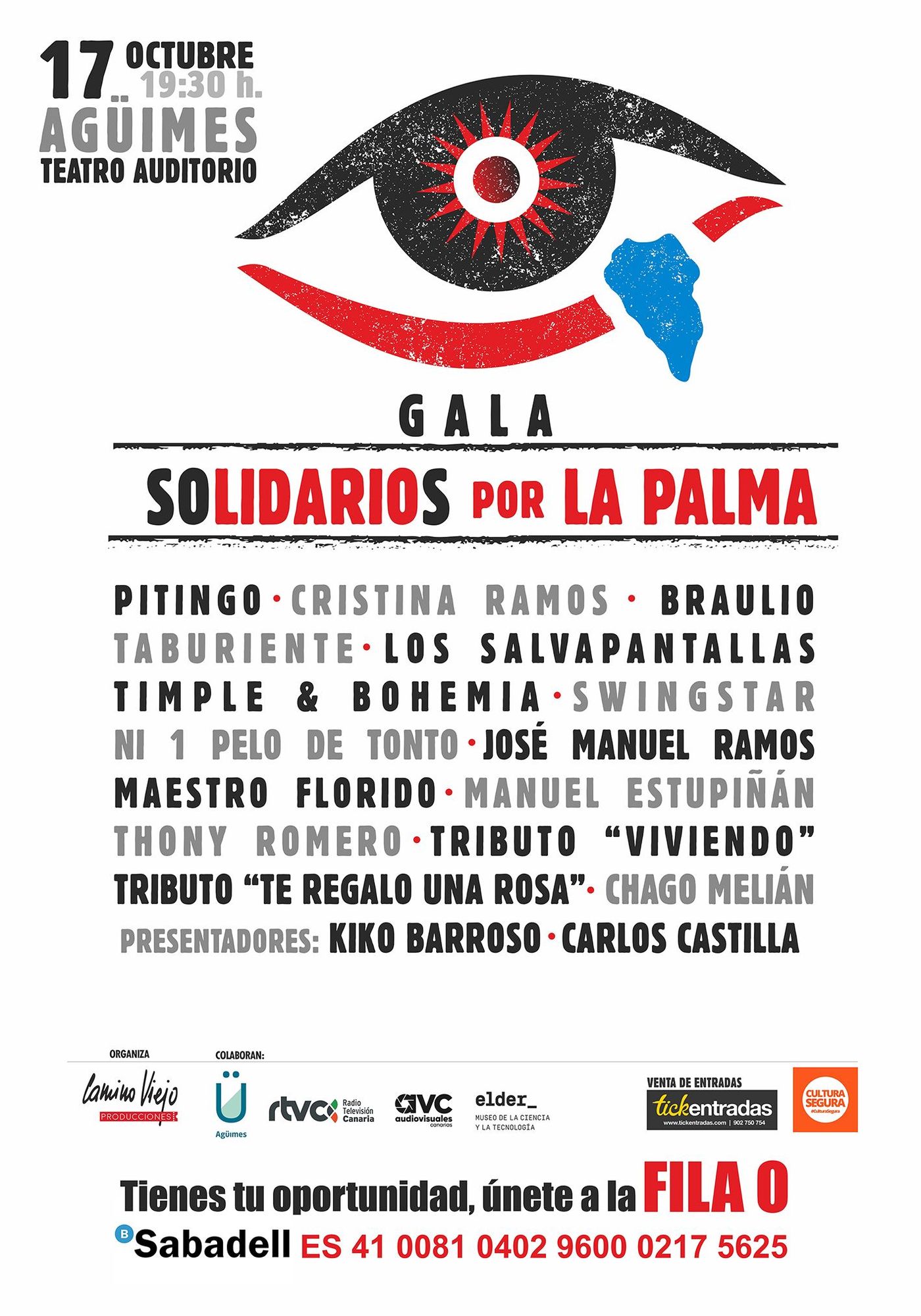 El Auditorio de Agüimes reunirá el próximo domingo 17 de octubre a una veintena de artistas canarios en la Gala 'Solidarios por La Palma' que organiza Camino Viejo Producciones. Todo lo recaudado con la venta de entradas se donará a las personas damnificadas por la erupción del volcán en la isla bonita . Tanto los artistas como el equipo de producción trabajarán de forma altruista en esta gala en la que también podrán realizar su aportación solidaria quienes no puedan acudir al auditorio a través del ingreso de la cantidad que deseen en la fila cero.