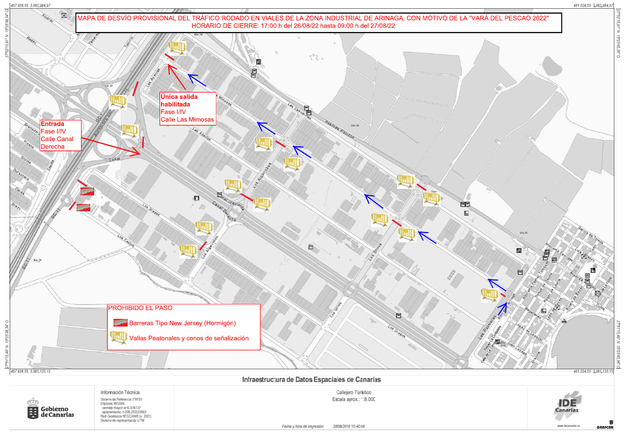 La Entidad de Conservación de la Zona Industrial de Arinaga, ECOAGA, informa en un Comunicado emitido ayer, que mañana 26 de Agosto desde las 17:00 horas a las 9:00 horas del sábado 27 de Agosto, y por motivos de la celebración de la fiesta “Vara del Pescao 2022”, se realizarán las limitaciones al tráfico rodado en las calles de la zona industrial que a continuación se detallan: