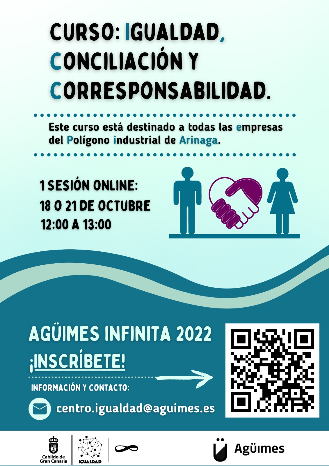 Desde el área de igualdad del Ayuntamiento de Agüimes organizan y dentro del marco del proyecto denominado: “AGÜIMES INFINITA 2022: IGUALDAD, DIVERSIDAD Y CORRESPONSABILIDAD”, se va a llevar a cabo un taller para las empresas de la zona industrial de Arinaga, denominado “IGUALDAD, CONCILIACIÓN Y CORRESPONSABILIDAD”, los días 18 ó 21 de octubre en sesión online en horario de 12:00 a 13:00 horas.