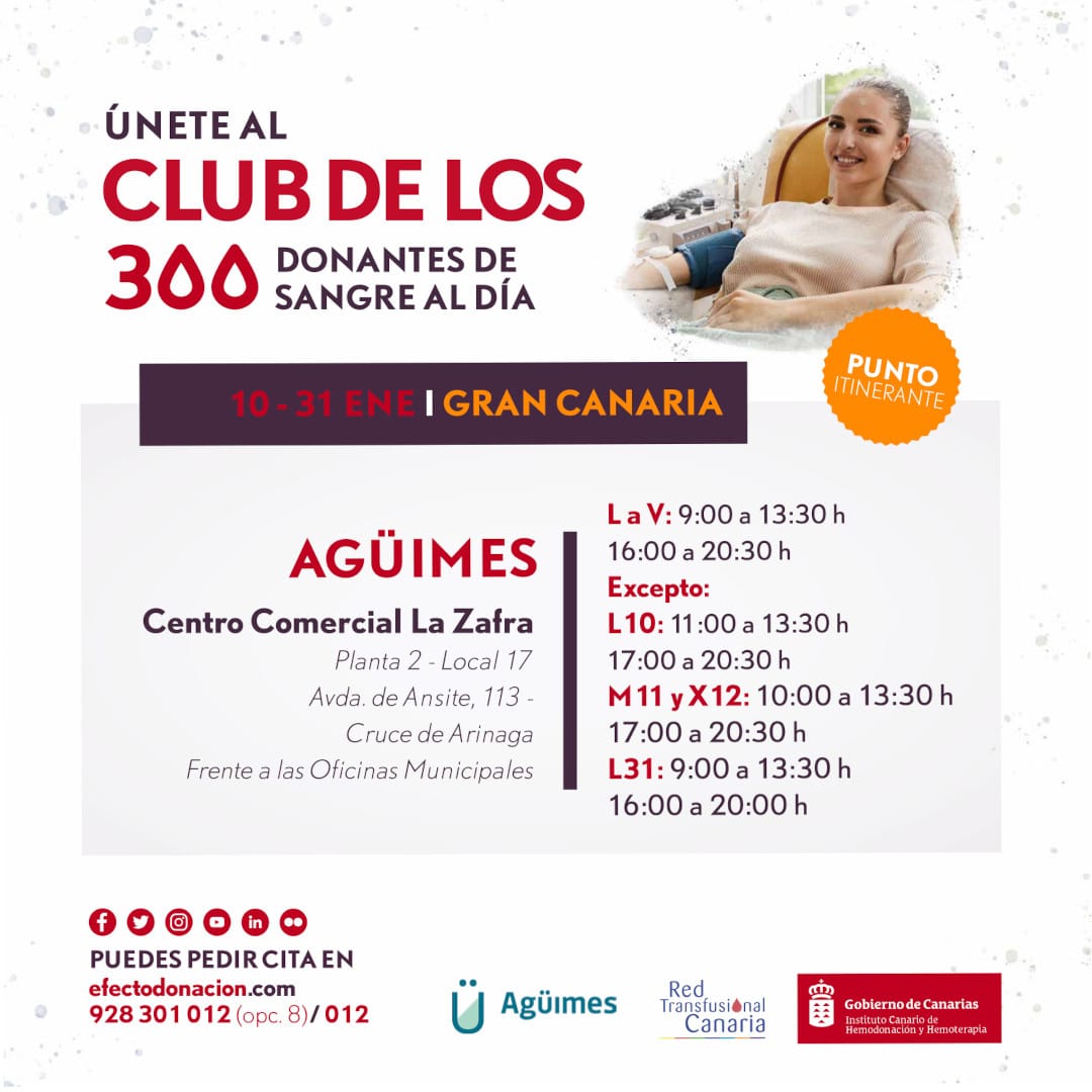 El Instituto Canario de Hemodonación y Hemoterapia mantiene abierto un punto temporal de donación de sangre en el Centro Comercial La Zafra, en el Cruce de Arinaga, atendiendo de lunes a viernes, en horario de 09.00 a 13.30 horas y de 16.00 a 20.30 horas.
