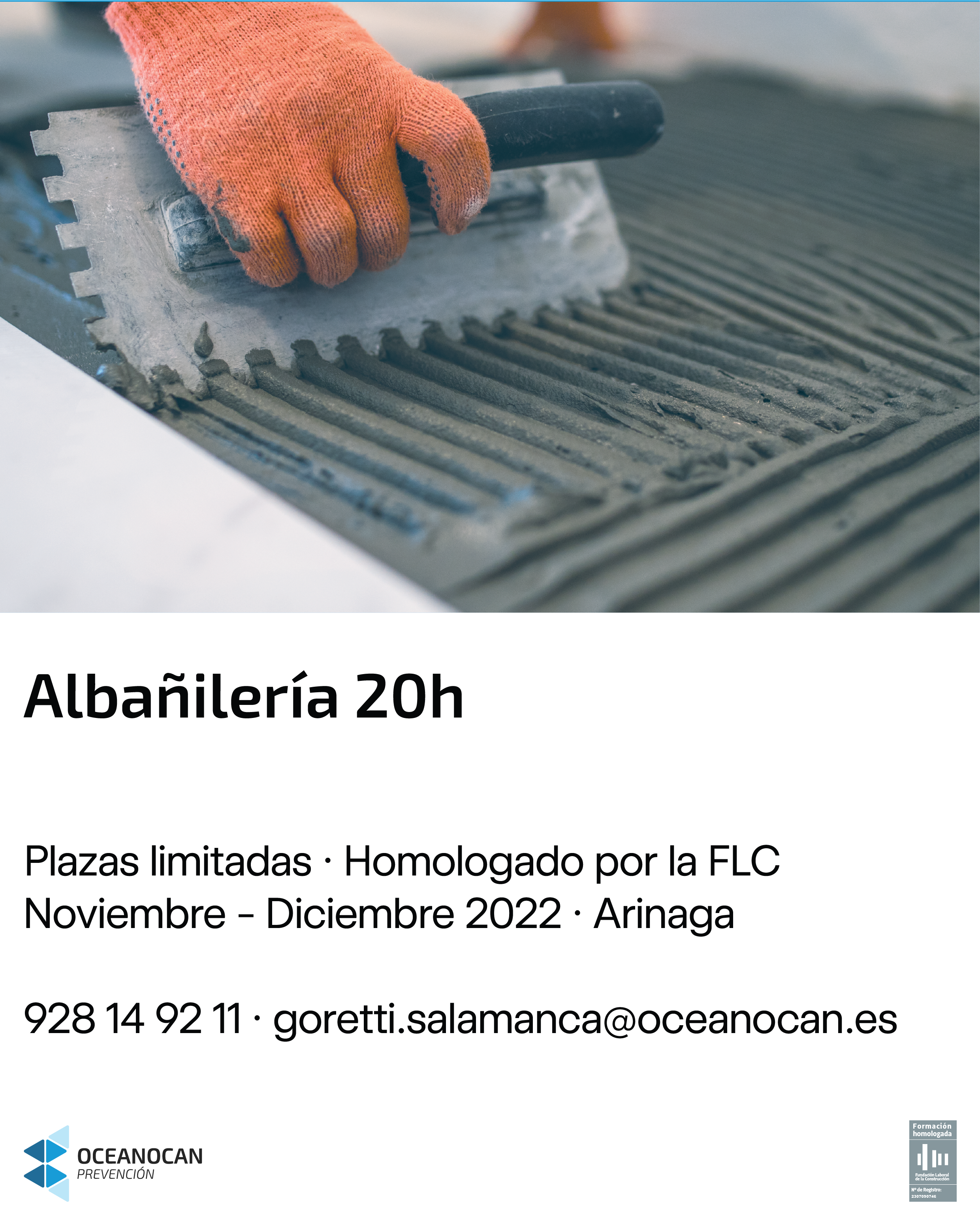 Próxima Edición del Curso de ALBAÑILERIA, de 20 horas de duración, en Modalidad Presencial. La formación se llevará a cabo en las instalaciones de Oceanocan Prevención S.L. ubicadas en la zona industrial de Arinaga, durante el mes de noviembre y diciembre.